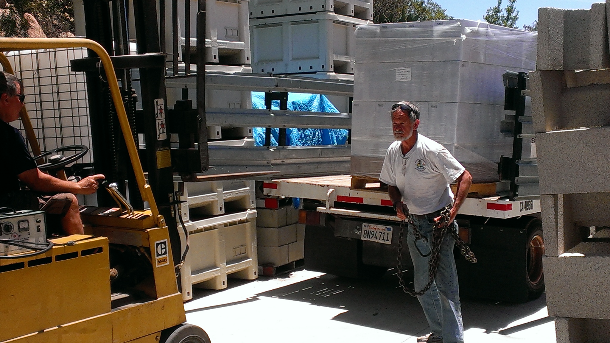 Tim and Andy unload empty bottles in preparation for bottling time.